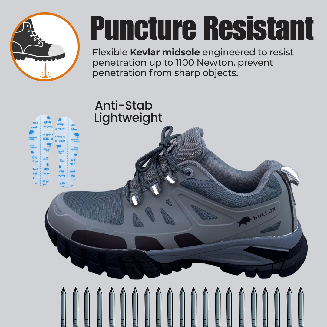 Midsole Kevlar Midsole - Puncture Resistance, Flexible Kevlar midsole engineered to resist penetration up to 1100 Newton, delivering high-performance safety while maintaining lightweight comfort and flexibility. |