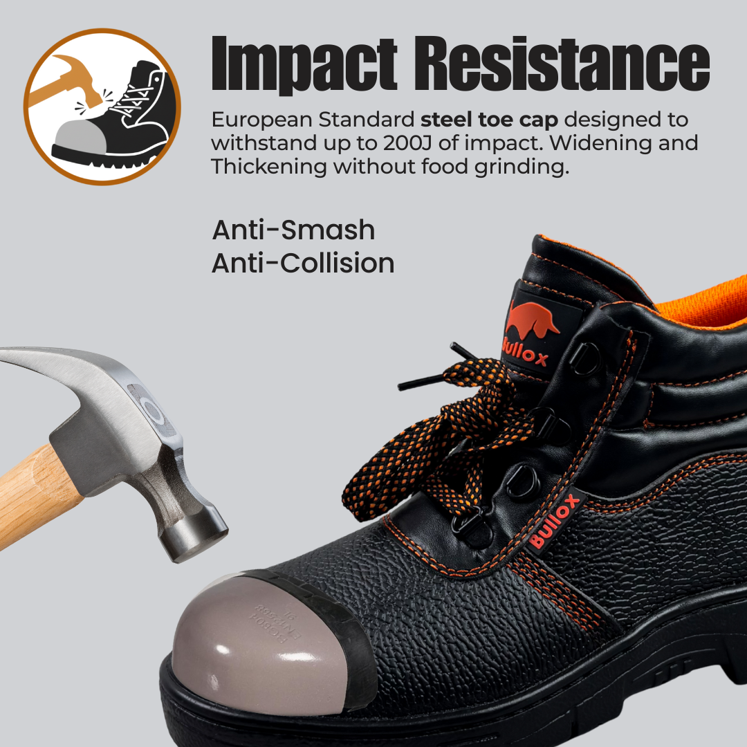 Toe Cap Steel Toe Cap - Impact Resistance, European Standard steel toe cap designed to withstand up to 200J of impact, delivering strong and durable protection against heavy impacts and crushing in hazardous environments. |