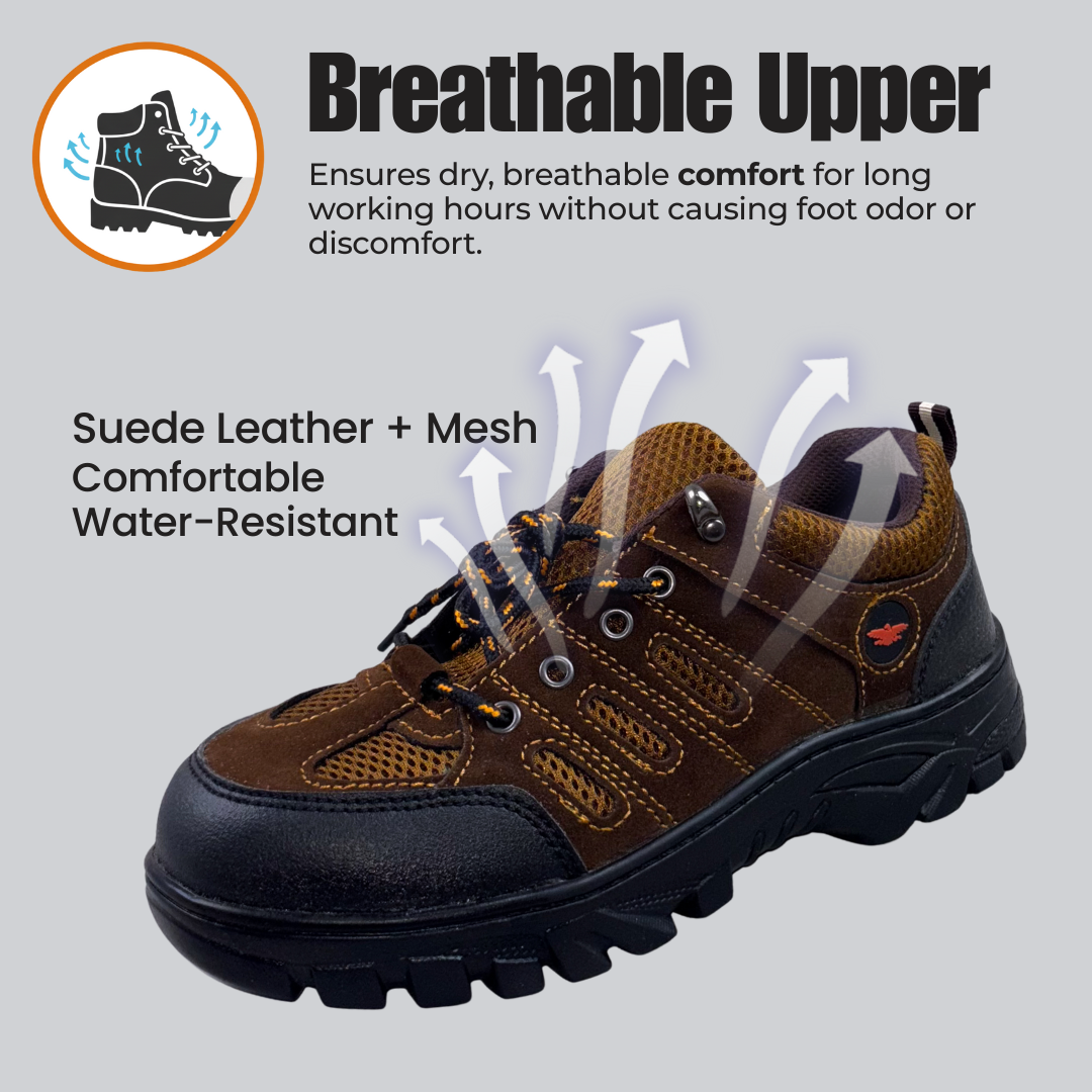 Upper material Suede Leather + Mesh - Ensures dry, breathable comfort for long working hours without causing foot odor or discomfort. The fabric lining has better moisture-wicking performance. |