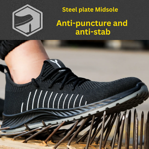 Midsole Steel Plate Midsole - Puncture Resistance, Lightweight steel plate designed to prevent penetration from sharp objects, ensuring reliable underfoot defense in hazardous work environments. |